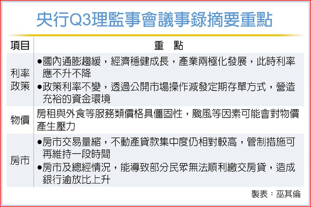 中央銀行30日公布第三季理監事聯席會議事錄摘要。多位理事認為,當前國內通膨趨緩,經濟穩健成長,但產業兩極化發展,贊同利率不升不降,並強調相較調降存款準備率,透過公開市場操作釋出資金更為彈性;房市方面,有理事提醒未來半年、一至兩年,整體房市及總體經濟情況,可能導致部分民眾無法順利繳交房貸,造成銀行逾放比上升。