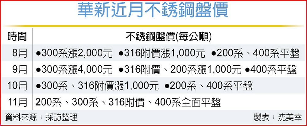 由於合金原料價格持穩或小幅上漲、新台幣貶值,華新30日宣布,11月不銹鋼盤元價格全維持平盤,其中300系不銹鋼終止連續五個月上漲。華新線纜事業受惠於台電強韌電網計畫持續釋單、國際銅價大漲,加上業外收益挹注,市場樂觀第三季EPS將優於第二季的0.12元。