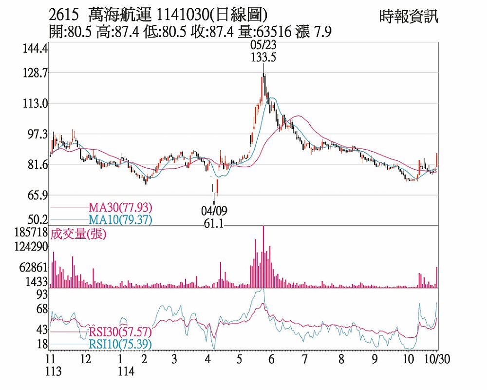 萬海(2615)30日開盤走高,中場後在一根長紅大量拉抬下,直攻漲停鎖死,終場以87.4元漲停價作收,成交量放大到近6.3萬張,終場漲停掛進買單高達16,225張,唯外資、投信分別賣超1,309張、3,035張,自營商買超2,214張;技術面一舉站上季線與年線,也順利突破前高,頗有打底完成的意味。