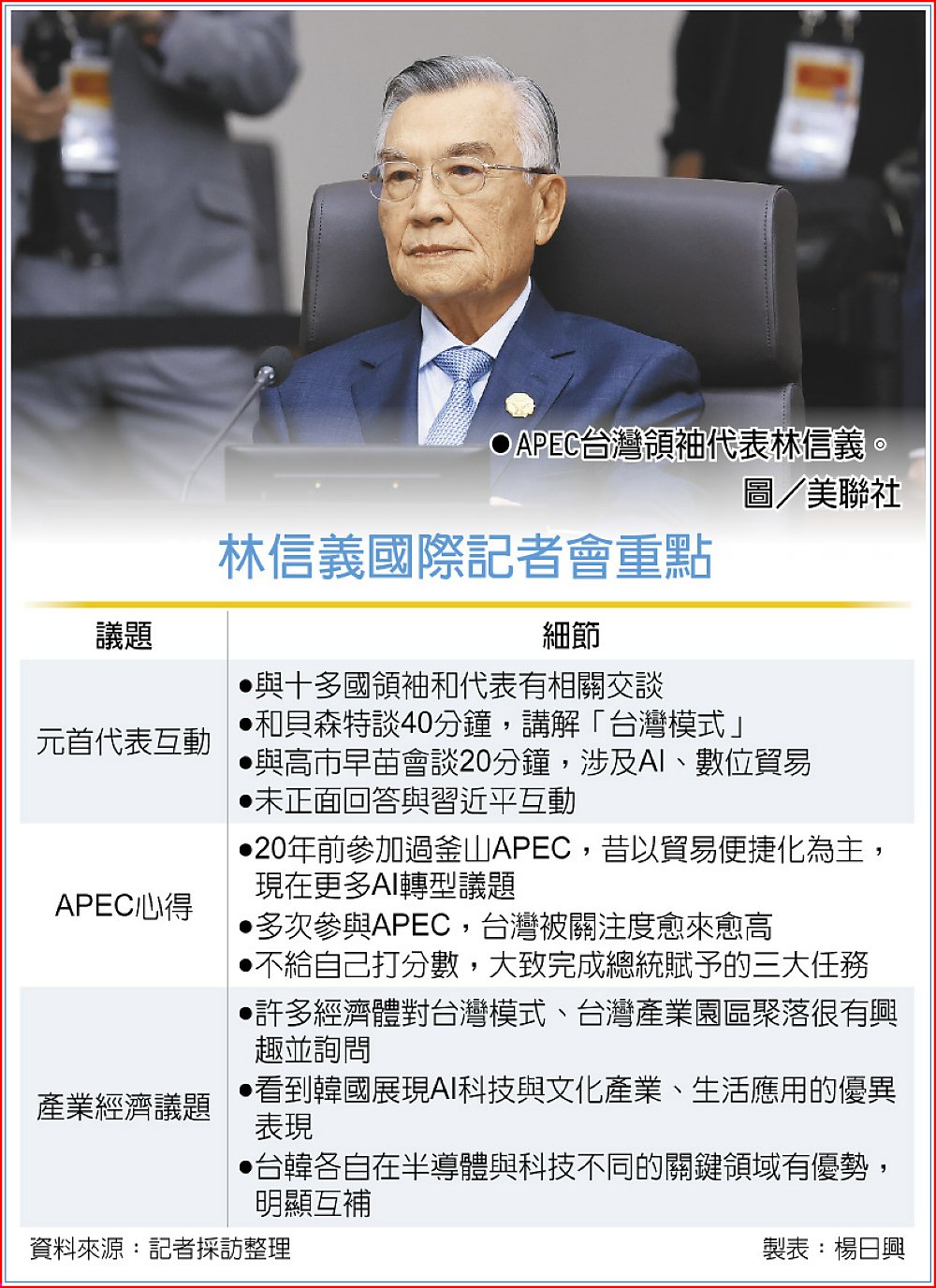 本次會議美國總統川普旋風式訪韓,領袖峰會舉行前已經離開,改由美國代表團團長、財政部長貝森特代表出席峰會。貝森特10月31日發文表示,當日和林信義見面會談,主要提到韌性供應鏈、在美投資等議題。
