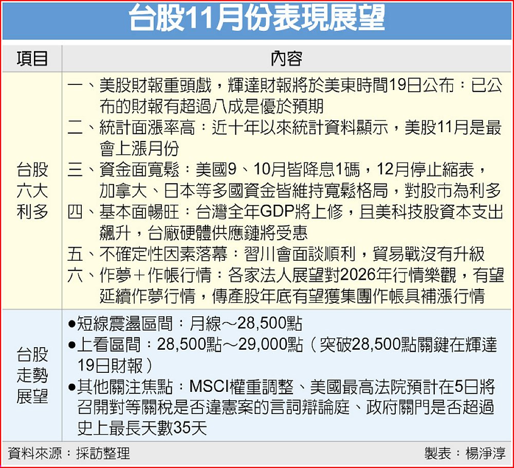兆豐投顧研究部副總黃國偉表示,台股11月題材相對較淡,關注點還有MSCI權重調整,另留意對等關稅是否違憲,若違憲對美股來說又會變成新的不確定性因素,預期台股在28,500點至月線間震盪,資金可能流向補漲股。(相關新聞見A3)