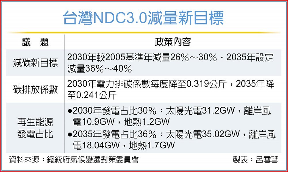 聯合國COP30大會預計10日在巴西登場,行政院近日可望核定台灣加速接軌國際NDC3.0減碳目標,在本周對外並向國際宣示,設定2030我國減碳較2005年基準年將加大減量26%~30%,2035年則減量36%~40%。其中,拍板綠電占發電配比2030年要達到3成,惟光電、風電開發落後,存在不小挑戰。