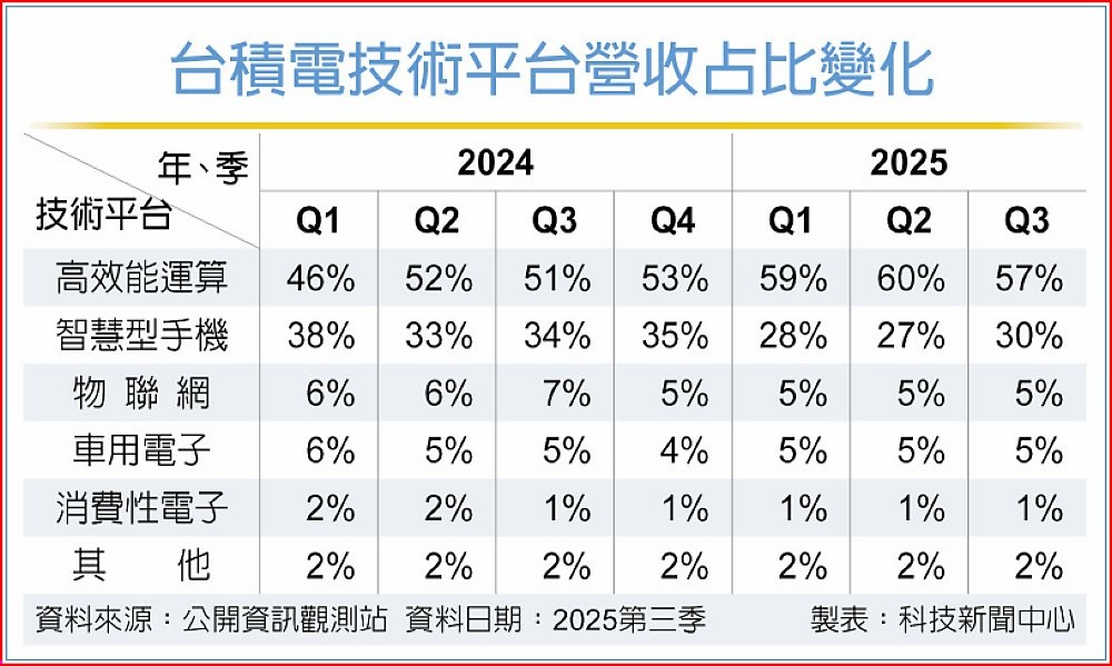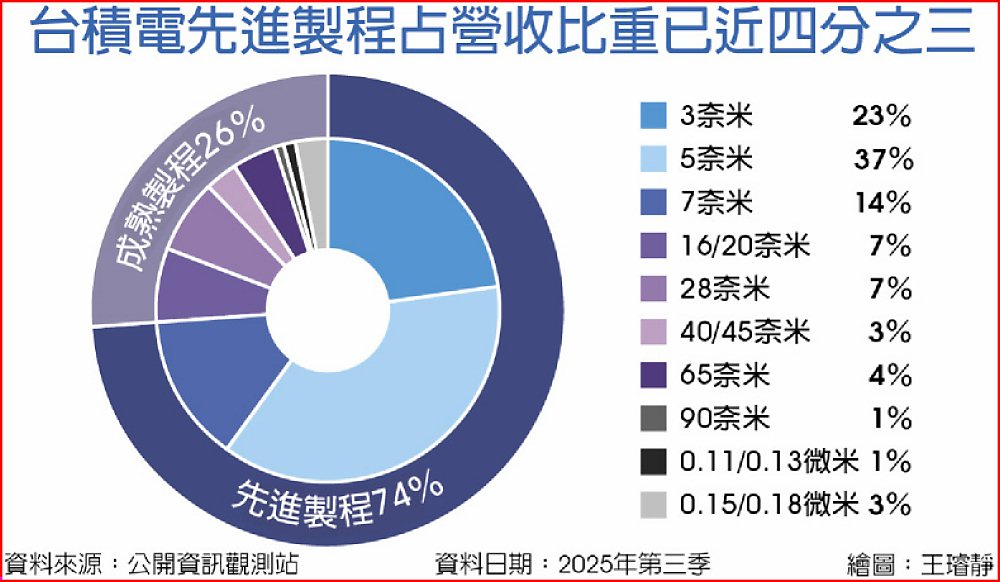 根據台積電財報,2025年第三季先進製程營收比重已達74%,其中5奈米占37%、3奈米占23%。法人預期,隨著2奈米明年量產,先進製程營收占比將進一步突破75%。