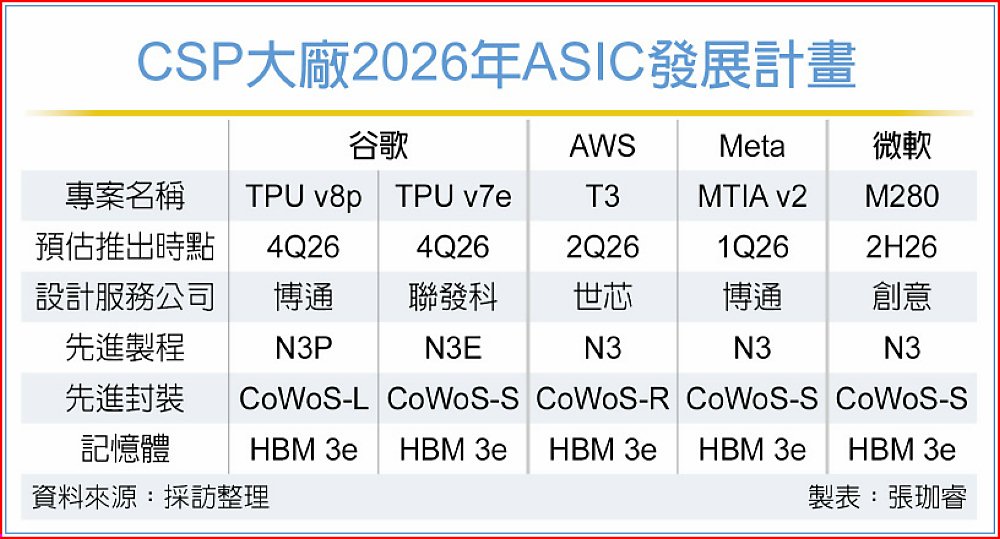 AI算力需求持續擴張,全球雲端服務供應商(CSP)競逐的焦點,已從單純擴建資料中心轉向「自製核心」。自研ASIC(客製化晶片)的新風潮正席捲全球,AWS、Google、微軟、Meta等巨頭全力投入,意在降低對NVIDIA、AMD等通用GPU的依賴。台廠ASIC業者創意、世芯-KY率先搶進,聯發科、聯詠等老牌IC設計公司也緊追上陣。