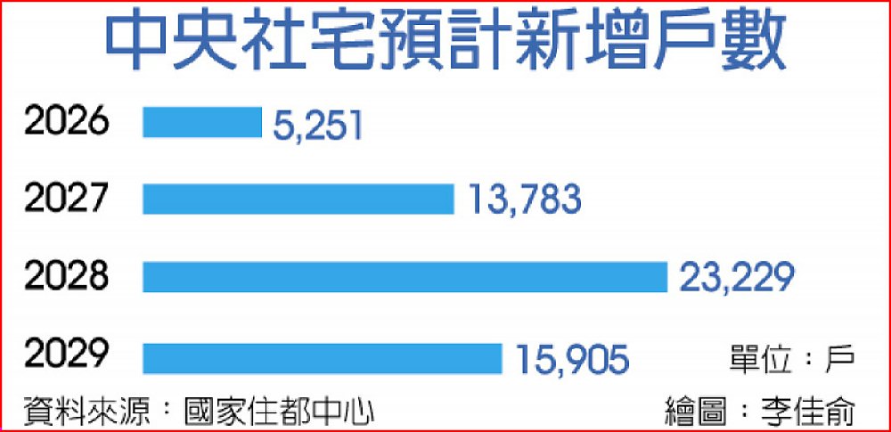 中央興建社會住宅12萬戶已在2024年底全數完成招標並陸續開工,未來幾年將是社宅的「完工豐收期」,統計從2026年至2029年的未來4年,國家住都中心可望釋出超過5.6萬戶社宅招租。其中,預計明年將於11個縣市、共22處新建完工社宅5,251戶,並提供婚育宅戶數1,050戶;而2027年將再釋出約1.3萬戶、2028年約2.3萬戶及2029年近1.6萬戶社宅完工招租。