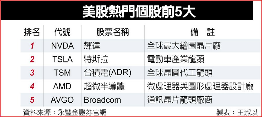 在美股個股中,輝達(NVDA)蟬聯最受台灣投資人青睞的海外標的,AI伺服器與晶片需求推升市值一度突破3兆美元;特斯拉(TSLA)雖股價震盪,但長期題材強勁,仍穩居投資人心中首選。台積電ADR(TSM)、超微(AMD)、博通(AVGO)等半導體股同樣名列前茅,反映AI供應鏈未來市場潛力無窮。