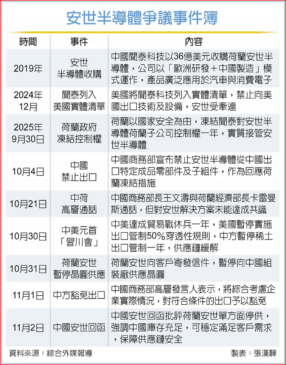 荷蘭政府9月底以國家安全為由,凍結中國聞泰科技對荷蘭安世控制權一年,並實際接管該公司。阿姆斯特丹援引1952年「貨物供應法」,罕見引用條款移除中國籍執行長張學政,設立臨時管理團隊。