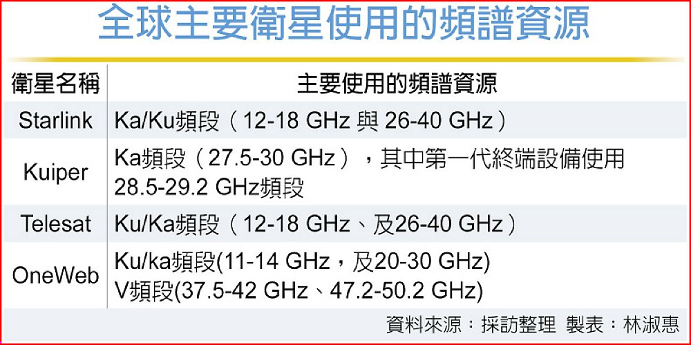 世界各國已將28GHz做為衛星主要頻段,全球主要低軌道衛星業者包括Starlink、Kuiper、OneWeb、Telesat第一階段使用的頻譜資源亦主要落在28GHz頻段,但該頻段的頻譜資源早在2020年由政府釋出供5G行動通訊業務使用,未來國際衛星陸續落地台灣時,恐發生5G與衛星訊號相互干擾情形。