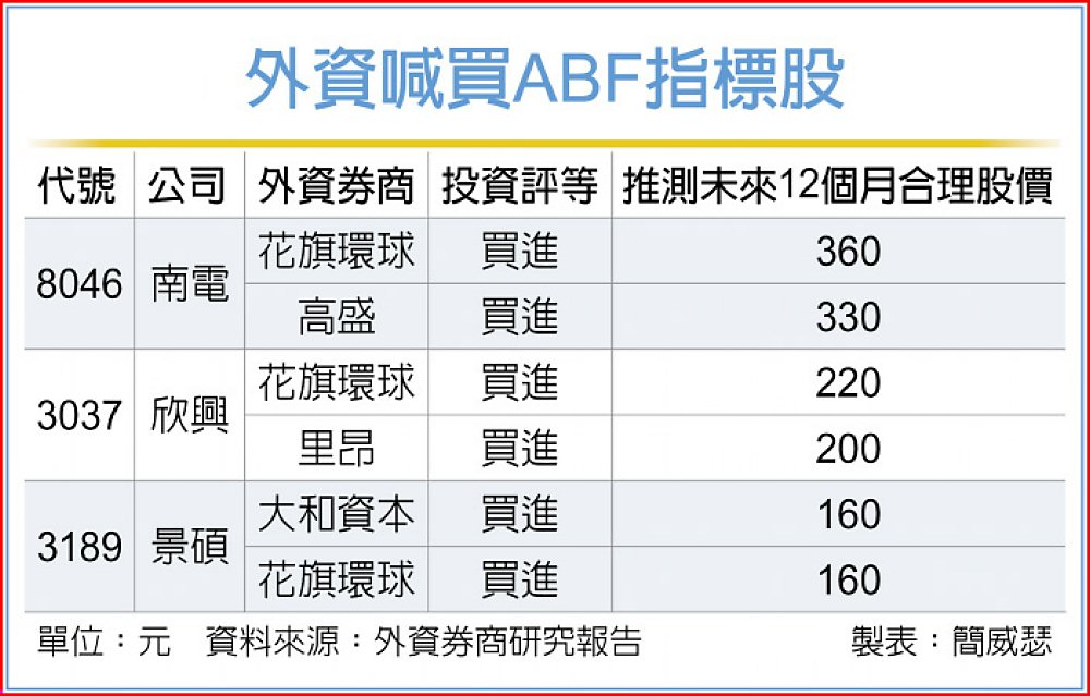 台股良性輪動行情持續上演,ABF族群不讓其他熱門股專美於前,再度搶占鎂光燈焦點。花旗環球加入升評南電(8046)看多行列,喊出外資圈最高的360元股價預期,同步調升景碩、欣興推測合理股價,與大和資本、里昂證券等共同為ABF多頭列車增添柴火。