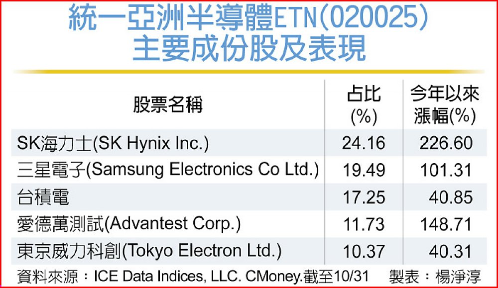 依據CMoney資料,截至10月30日止,統一亞洲半導體ETN全年漲幅超過60%,居市場指數型商品包含ETF,不含槓桿類第二;該指數前五大成份股為SK海力士占24.16%、三星電子占19.49%、台積電占17.25%、愛德萬測試占11.73%以及東京威力科創占10.37%權重,占比總和超過80%。