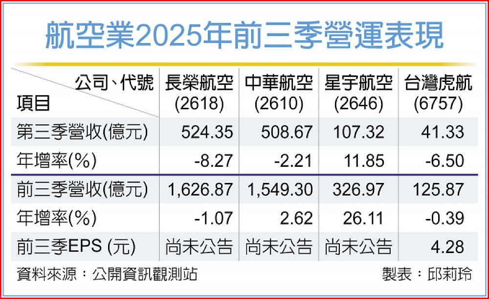 本周起也進入航空族群超級財報周,虎航已率先公布財報,第三季稅後純益4.71億元、年減50%,EPS達1.03元,前三季稅後純益19.69億元、年減20.5%,EPS為4.28元,低於市場預期。緊接著,華航將在7日公布前三季財報。