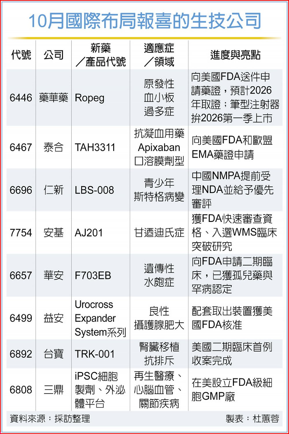 光輝10月台灣生技產業新藥開發、國際藥證布局紛紛駛入快車道,從血液腫瘤、罕見疾病到AI生成新藥,藥華藥(6446)、泰合(6467)、仁新(6696)、安基生技(7754)等多家業者陸續推進全球臨床與取證進程,顯示台灣創新藥研發正加速邁向國際市場。