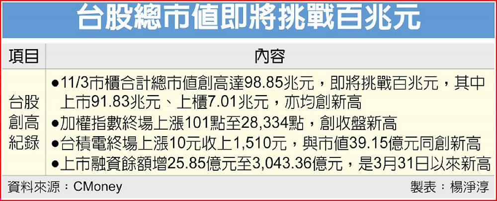 台股11月開局第一天盤中震幅加大,尾盤在台積電拉升下,推升加權指數翻紅上漲101點收歷史最高收盤價28,334點,市櫃合計市值跟著翻升創新高至98.85兆元。市場推估,當台積電達標1,555元,台股上市櫃市值將衝百兆元。