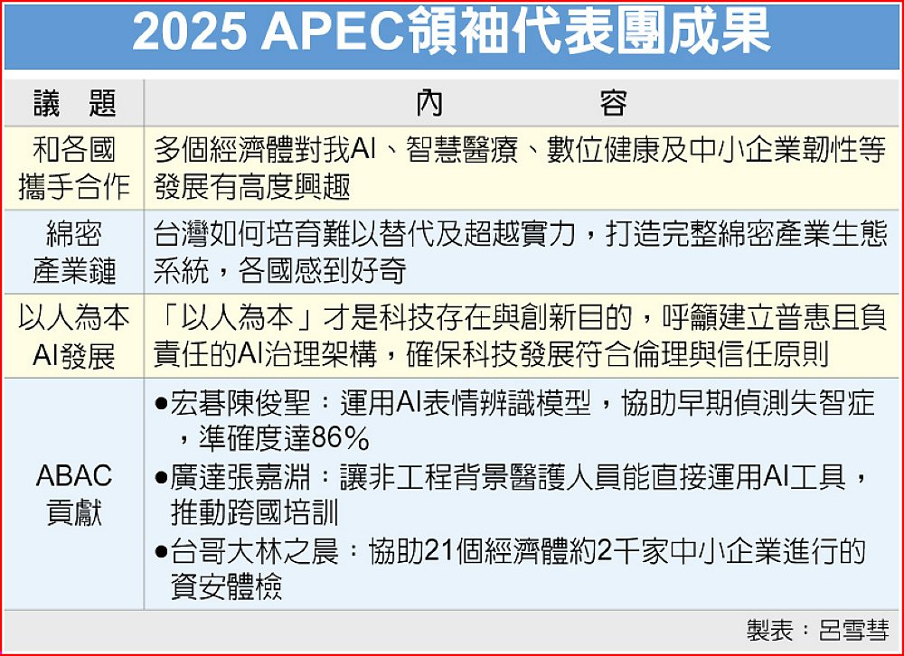 我APEC領袖代表總統府資政林信義3日表示,台灣在半導體、AI領域表現優秀,各國對台灣在AI、智慧醫療、數位健康及中小企業韌性等領域的發展,表達高度興趣與肯定,他明顯感受「花若盛開,蝴蝶自來」氛圍。對於明年大陸是APEC主辦方,他強調,我們是APEC會員,應該平等被尊重對待,APEC是重要國際經貿場域,不能沒有台灣的聲音以及參與,「世界需要台灣。」