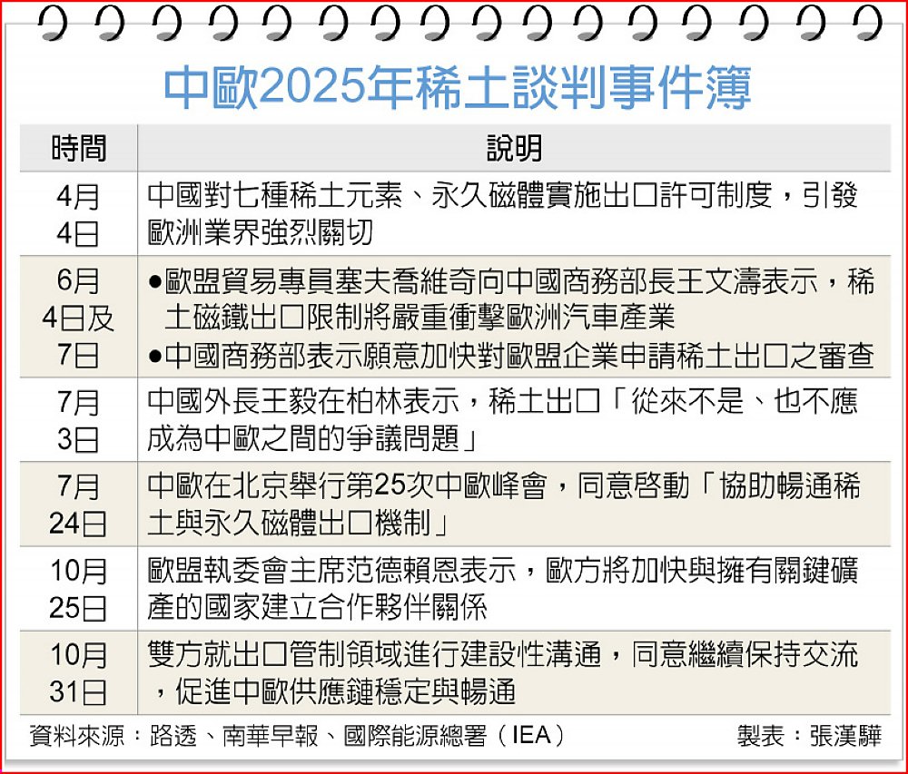 北京在今年4月祭出稀土出口管制,歐洲產業立即感受到壓力。歐盟從6月起多次表態稀土管控已嚴重衝擊歐洲產業鏈,中國也做出部分讓步,例如加速審批、提出機制協議等,但歐洲對於「制度性、長期機制」仍要求更高標準。