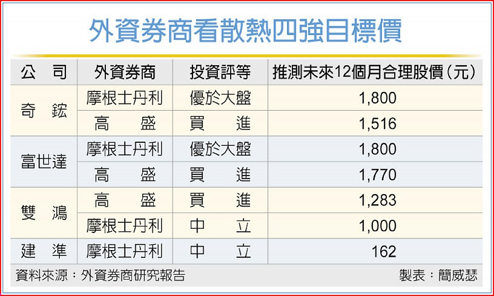 散熱族群3日挾摩根士丹利證券持續力挺,看好散熱零組件設計內含價值提高,激勵散熱四強攜手走揚,其中,大摩最青睞奇鋐、富世達後市,2檔最新推測合理股價都是1,800元,有逾2成上檔空間可期,對雙鴻、建準投資評等雖為「中立」,仍同步調高推測合理股價。