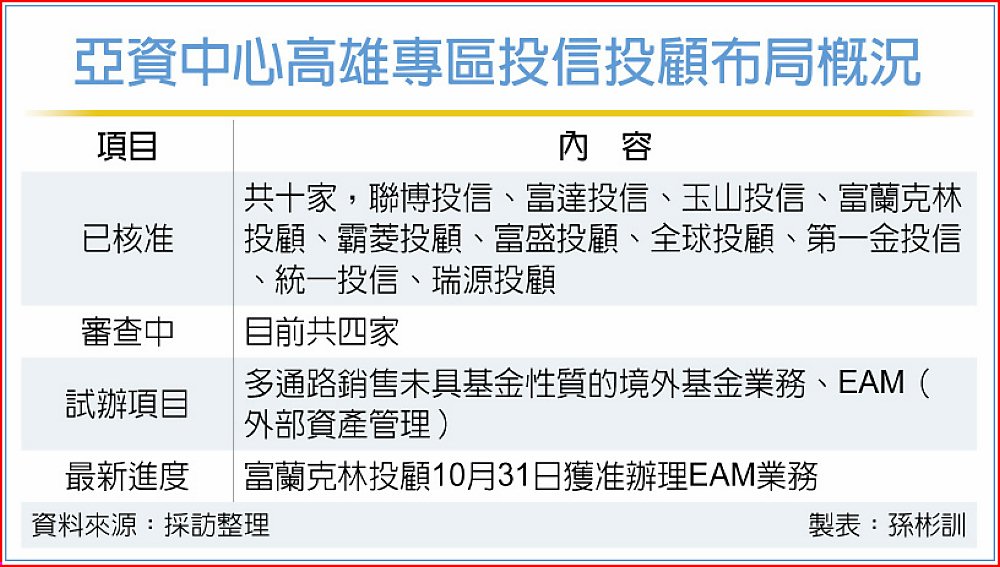 金融機構激戰亞洲資產管理中心高雄專區,投信投顧業視此為重大商機進行布局。據統計,金管會已核准十家投信投顧業者進駐,策略也相當一致,多鎖定與專區內的銀行、證券商跨業合作,一來擴大產品範圍並引進具特色商品,二則鎖定私募相關基金,以此切入高資產客戶並與銀行更深入的整合。