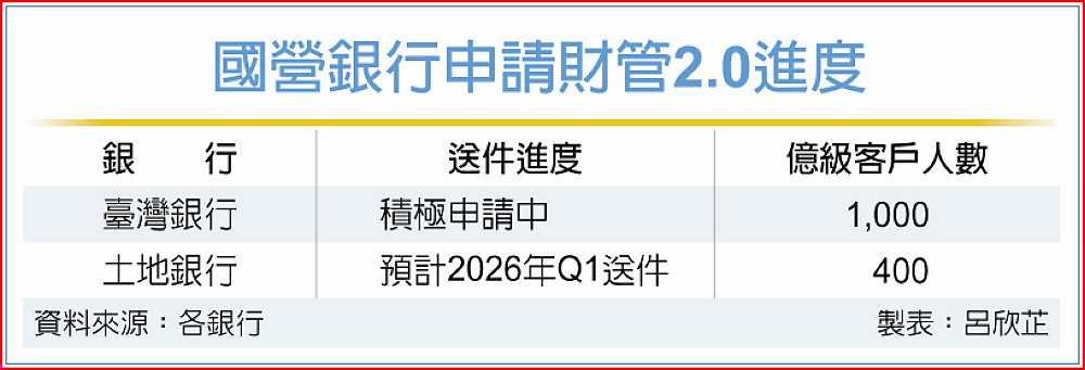 國營銀行加緊升級財管2.0腳步。據統計,臺灣銀行、土地銀行資產達億元以上的高資產客戶,合計超過千人,臺銀積極向金管會申辦高資產業務,土銀則預定於2026年第一季送件申請,兩銀行均表達前進亞資中心區的強烈企圖。