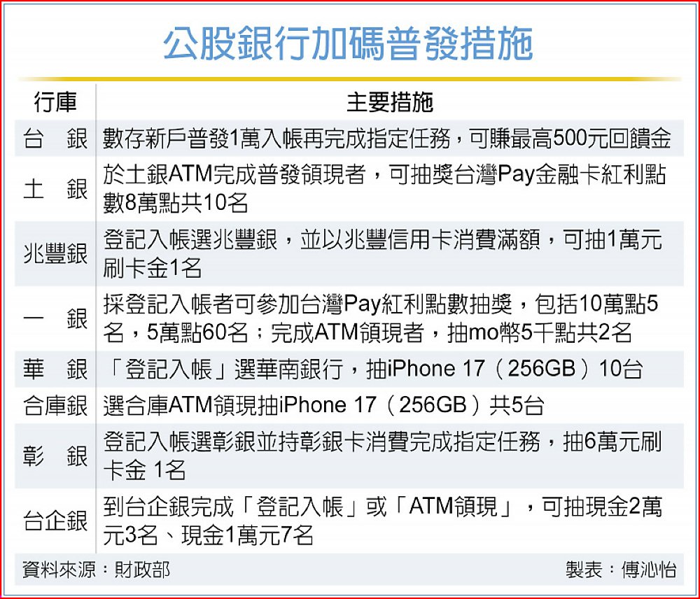 「全民+1政府相挺」普發現金登記入帳將於5日開放網路登記,財政部3日表示,公股銀行積極響應,就登記入帳及ATM領現分別推出多項限時優惠,包括現金、刷卡金、iPhone手機及台灣pay紅利點數都有,其中以華銀及合庫各抽10支和5支iPhone最引人注意。