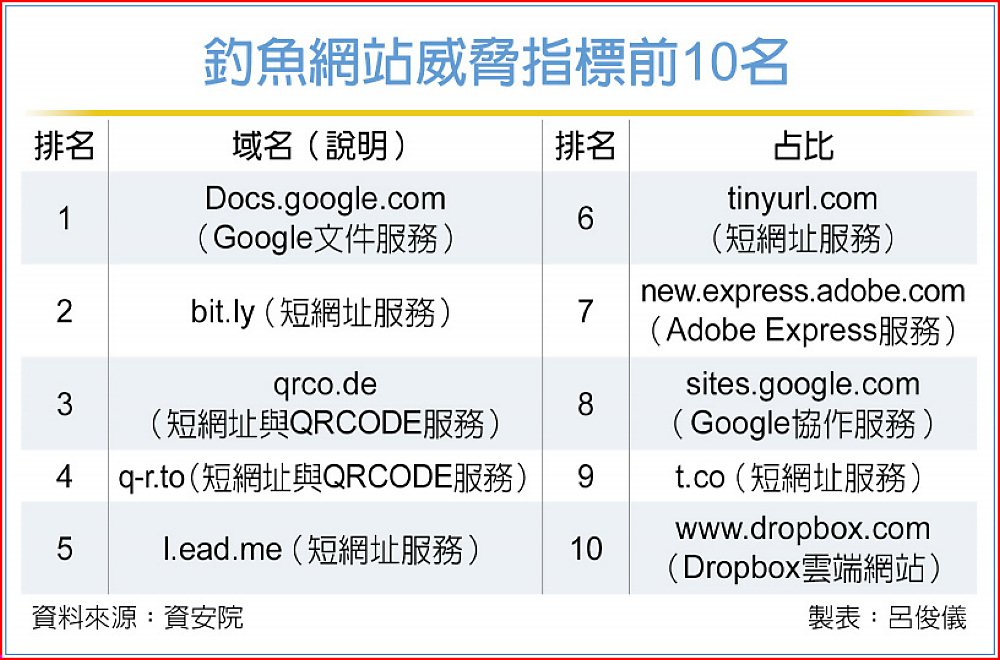 短網址服務具易讀、美觀及便利優勢,但經常遭到濫用。資安院歸納今年1至9月全球共1,500萬餘筆釣魚網站威脅指標,前10名中有過半為常見的短網址服務(如bit.ly、tinyurl.com、t.co),凸顯廣泛被用於隱匿釣魚網站,讓使用者點擊連結前難以辨識真偽。