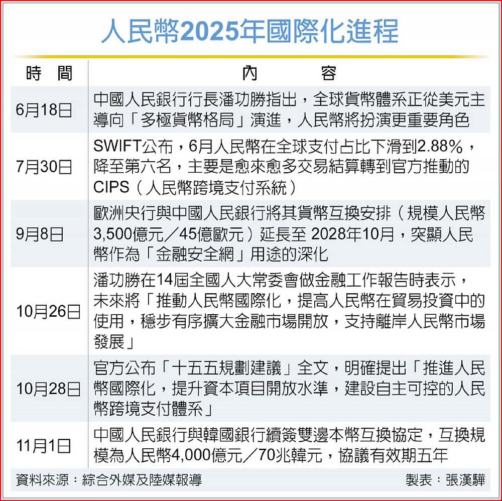 大陸官方10月底公布的「十五五規劃建議」全文,針對「擴大高水平開放」,其中明確提出「推進人民幣國際化,提升資本專案開放水平,建設自主可控的人民幣跨境支付體系」。等於將人民幣國際化列入未來發展方向。