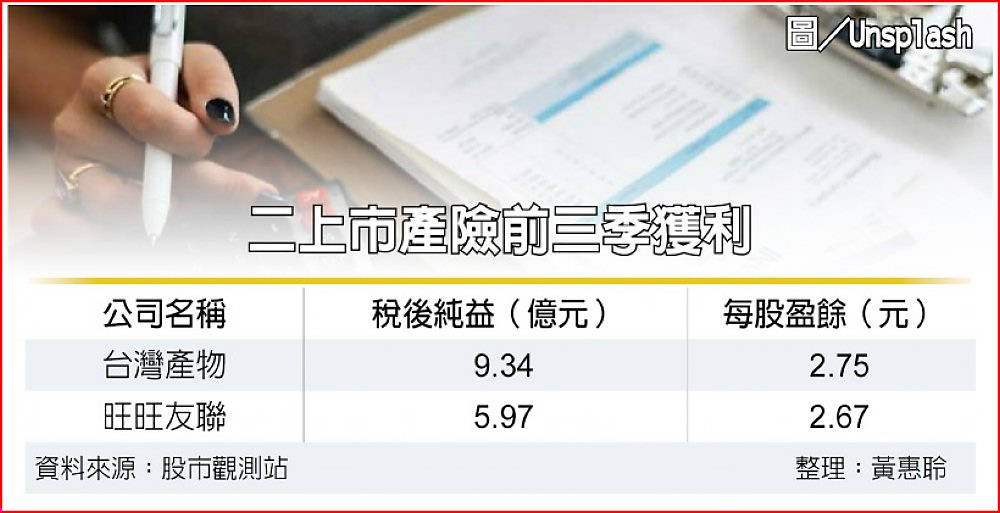 上市產險公司第三季財報陸續出爐,台灣產物保險與旺旺友聯產物雙雙繳出亮眼成績。中央再保、新光產物及第一保即將在近期召開董事會,預期應可交出不錯的成績單,產險業整體營運表現維持穩健。