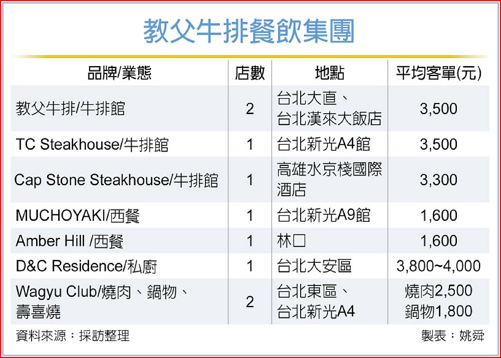 教父牛排集團去年全台8店總營收約4.8億元,今年受通膨、關稅與國人瘋出國影響,高端餐飲市場成長趨緩,教父牛排集團力拚全年營收持平。