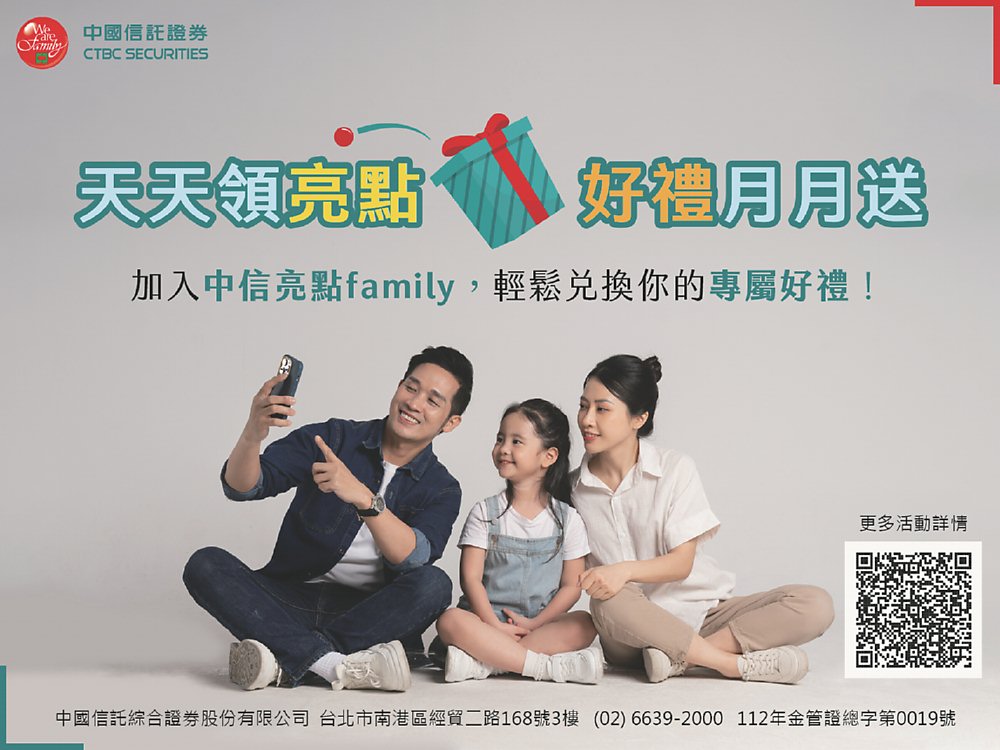 中國信託證券以「像家人般陪伴客戶」為核心精神,持續深化金融與生活的連結,全新推出「中信亮點family」平台,結合投資、生活與回饋,讓投資同時累積亮點點數,享受生活樂趣。