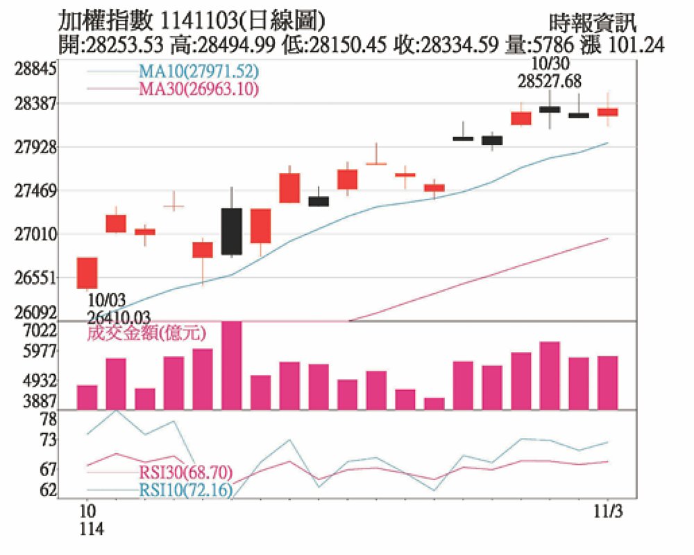 盤勢分析與投資策略:台積電啟動與客戶年度議價溝通,預估2026年持續調漲7奈米以下報價漲幅約3~10%,創下台積電連續第四年調漲價格,AI與HPC將成為主要受益產品。受到記憶體供應吃緊,第四季DRAM合約價漲幅上修至25~30%,目前PC OEM持續積極採購拉高庫存,三大原廠僅海力士率先達成合約,三星和美光則對合約採拖延策略,呈現現貨報價與模組合約價持續上漲態勢,3日南亞科續創145.5元新天價、華邦電57.5元波段新高。就台股技術面來看,台股仍沿5日線震盪上漲,技術指標MACD呈現翻揚,短線拉回至5日線為觀察指標。