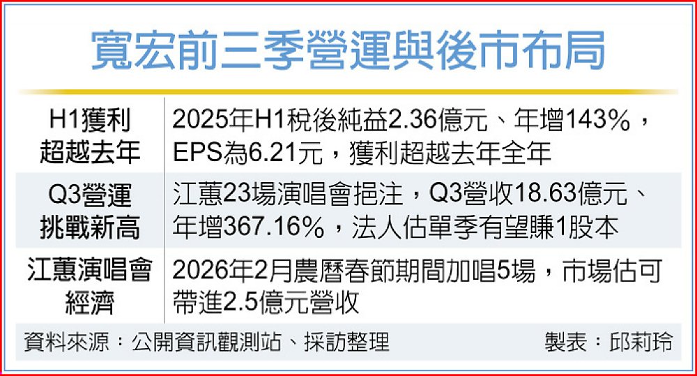 寬宏上半年稅後純益2.36億元、年增143%,EPS為6.21元,獲利已超越去年全年的2.09億元,第三季有江蕙演唱會助攻下,法人估今年全年EPS上看16~18元新高。寬宏明年2月營運還有江蕙演唱會票房挹注,也規劃舉辦大型音樂劇與多場流行演唱會等。