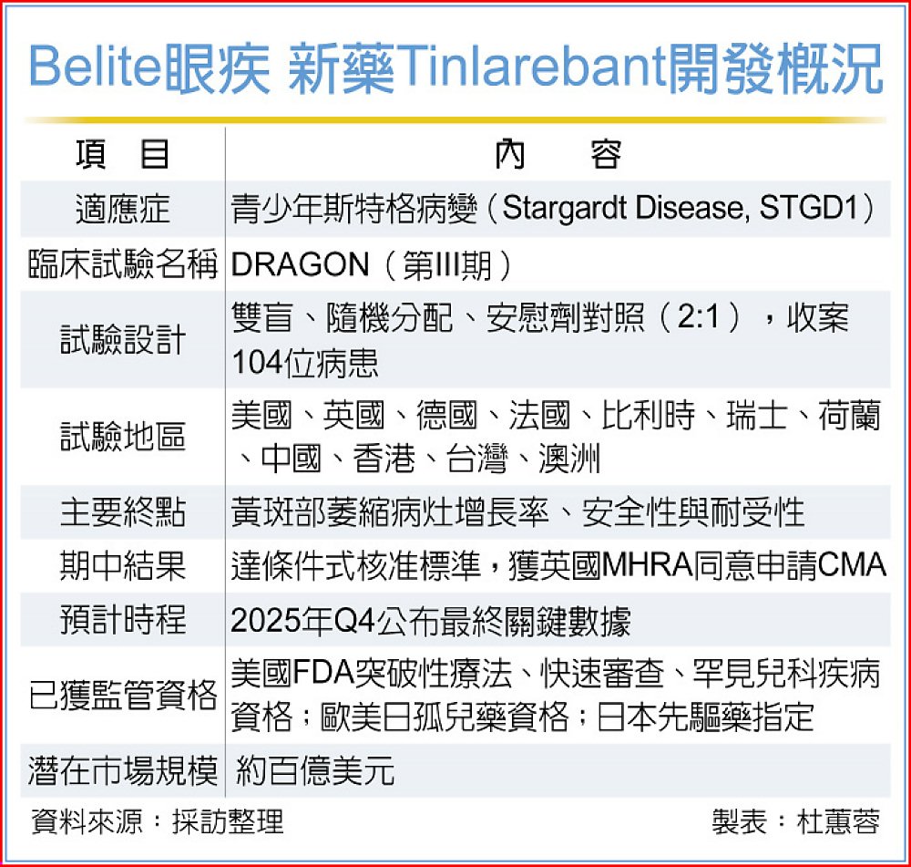 仁新(6696)3日宣布,美國子公司Belite Bio(那斯達克代碼:BLTE)獲英國藥品與醫療產品監管署(MHRA)同意可依據治療青少年斯特格病變(STGD1)新藥LBS-008第三期臨床試驗「DRAGON」的期中結果,提交條件式上市許可(CMA)申請,有機會拿下全球首款治療此罕見眼疾藥物的藥證。