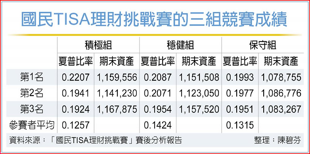 本場交叉論壇「擴大全民參與TISA 補足退休第三支柱」是由陳彥行主持,並對為期三個月的「國民TISA理財挑戰賽」最終成績進行分析報告。他表示,積極型投資人在三個月的投資期,100萬元可以增長近116萬元、報酬率接近16%、夏普比率0.22;穩健型報酬率大約15%、夏普比率0.20,保守型報酬率大概接近8%、夏普比率0.19,受惠於台股近期表現不錯,基金投資的成果可以媲美規模最大的市值型ETF0050。