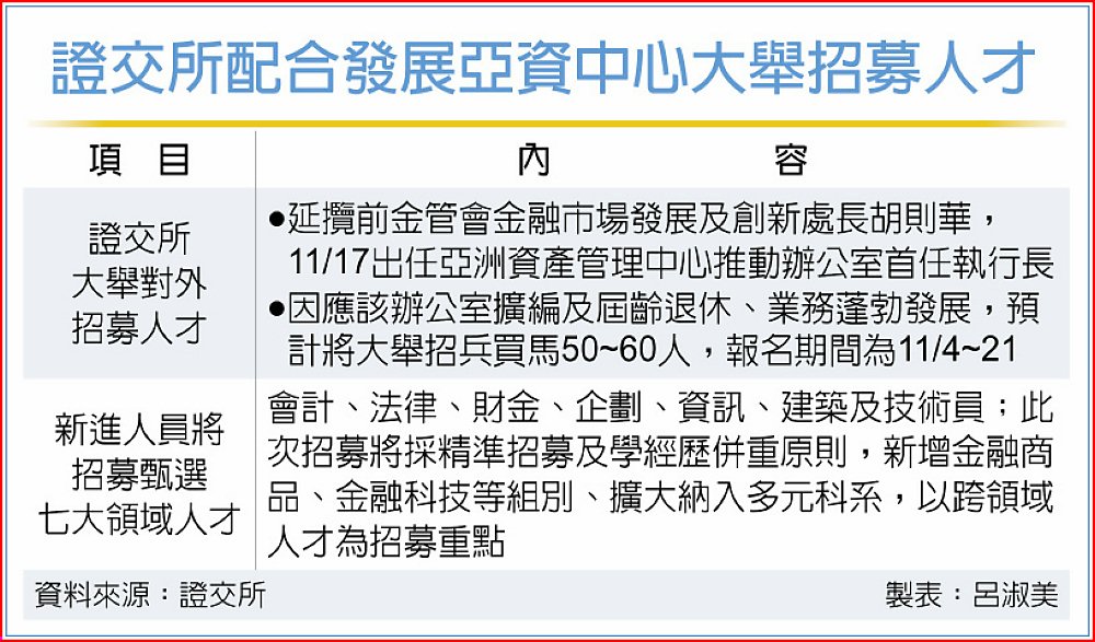 政府發展亞洲資產管理中心火力全開,前金管會金融市場發展及創新處處長胡則華預計本月17日到任,接掌亞資中心推動辦公室首任執行長,臺灣證券交易所4日也宣布啟動114年新進人員招募甄選,因應該辦公室擴編,證交所此次將大舉招兵買馬50~60人,為近年來罕見的最大規模。