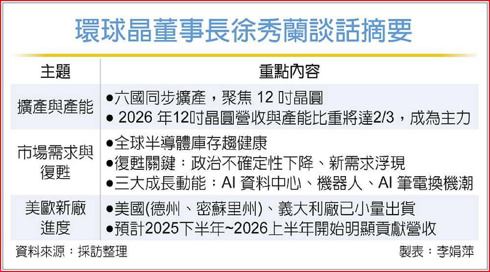 環球晶4日舉行法人說明會,董事長徐秀蘭指出,隨著AI浪潮與在地化趨勢加速,環球晶的全球擴產布局正進入收穫期,將成為中長期營運成長的關鍵動能。