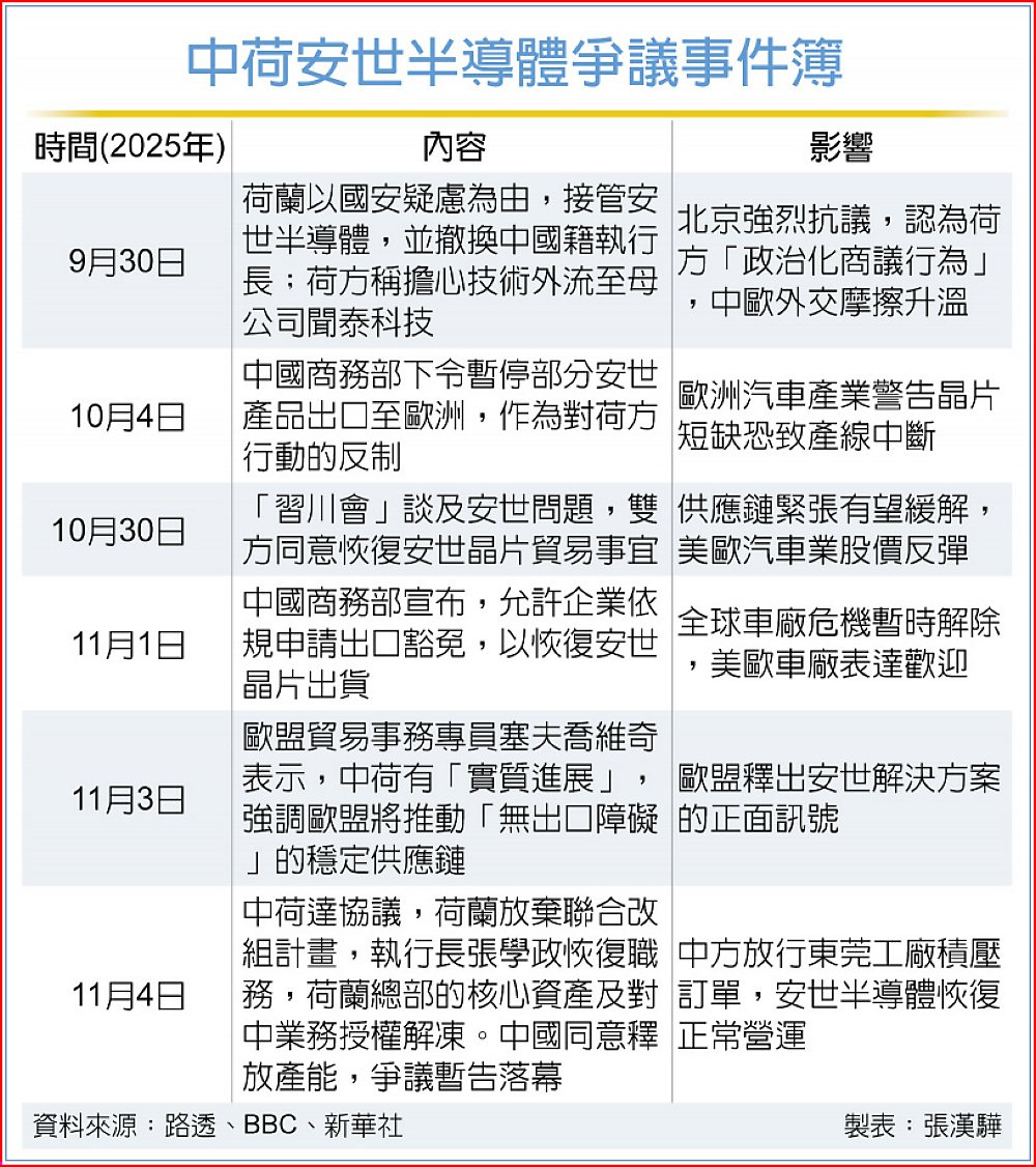荷蘭政府9月30日接管安世後,中方曾暫停部分晶片出口,導致歐洲汽車製造商陷入生產危機。在此僵局下,中國與歐盟於10月31日至11月1日在布魯塞爾舉行「升級版」出口管制對話磋商。歐盟貿易事務專員塞夫喬維奇(Maros Sefcovic)3日預告,中荷有關安世的談判正取得進展,隨後便公布「中歐稀土與半導體供應鏈臨時協調紀要」的大和解消息。