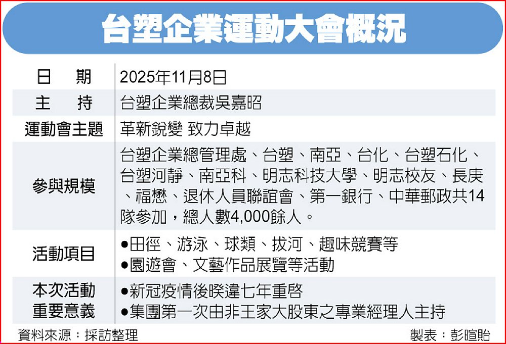 台塑企業最近一次運動會是2018年,2020年因新冠疫情開始停辦七年;今年重啟召開,不僅有王文淵領軍的管理中心四位常委全力支持參與,更是集團第一次由專業經理人、新任總裁吳嘉昭主持,期盼在當前集團營運力拚轉型之際,再次凝聚、展現上下一心的團結能量。