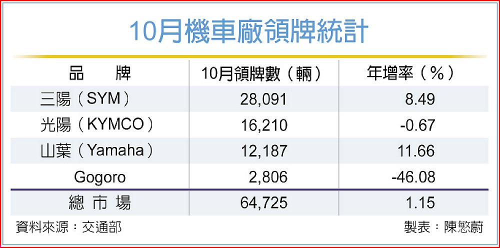 10月前三大機車廠中,除龍頭三陽銷售續穩,光陽以1.62萬輛居次,市占率25%;台灣山葉亦維持1.22萬輛水準,市占率18.8%;電動機車車業者Gogoro則以2,806輛、市占率4.3%位居第四。累計前十月國內機車總銷量59.06萬輛、年減5.78%,三陽累計掛牌26.27萬輛、年增2.22%,市占率達44.5%,是前四大車廠中唯一正成長的品牌。