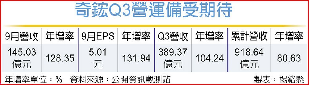 奇鋐(3017)公布9月自結獲利,9月營收145.03億元,年增128.36%;稅後純益19.58億元,單月每股稅後純益(EPS)5.01元,年增131.94%。受AI伺服器與手機散熱需求拉動下,同步創下高成長曲線,公司預計於11月12日公布第三季財報,屆時將見整季營運佳績。