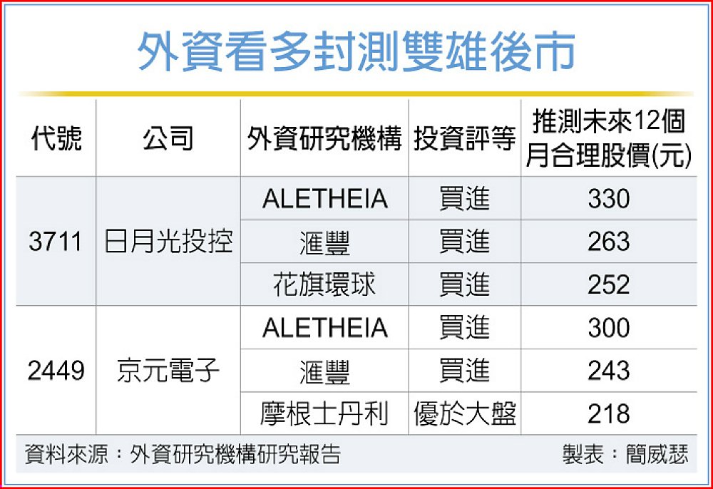 台股4日與亞股其他主要市場齊下挫,封測雙雄股價雖同樣開高走低,日月光投控終場下跌2.85%、收239元,京元電跌幅更達4.46%收214元,股價幾乎回測5日線。所幸,內外資研究機構持續看多基本面,給出的目標價持續調升,封測雙雄不愧是盤面當紅炸子雞。