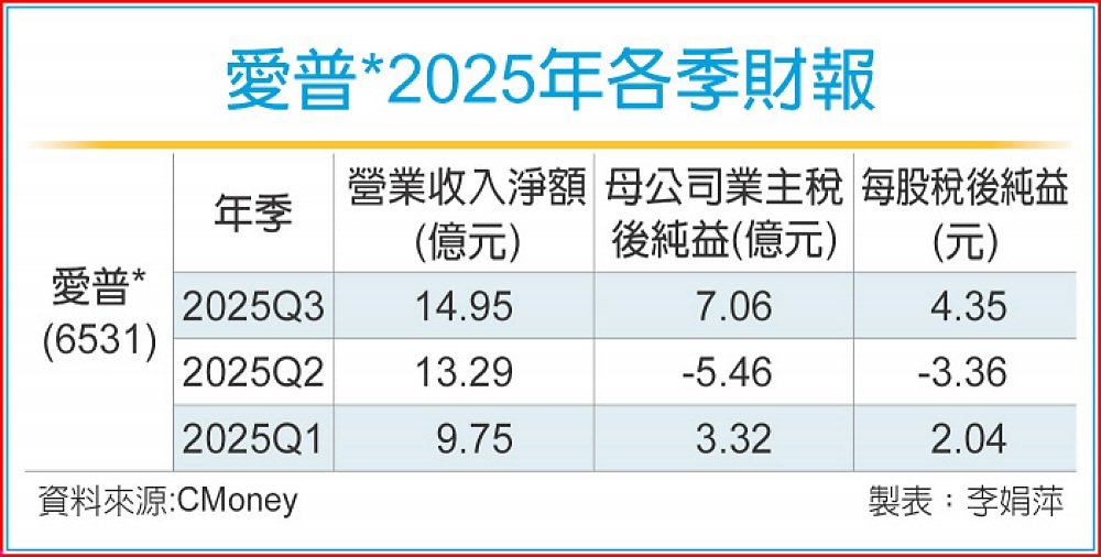 愛普*(6531)受惠核心業務動能強勁,加上美金對台幣匯率回穩、利息收入和金融資產評價利益等業外貢獻加成,第三季稅後純益7.06億元,刷新歷史紀錄,每股稅後純益(EPS)4.35元。