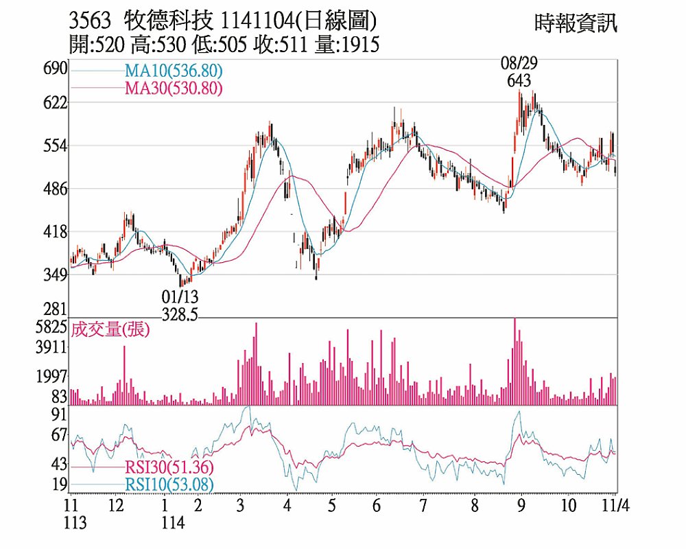 設備廠牧德(3563)4日除權息,股價逆勢上漲3.76%,收511元,成交量1,915張,顯示市場投資人積極參與該公司除權息行情。牧德本次除權息,合計配發2元股利,現金股利1元、股票股利1元,基準日為11月10日,現金股利發放日訂於12月3日。