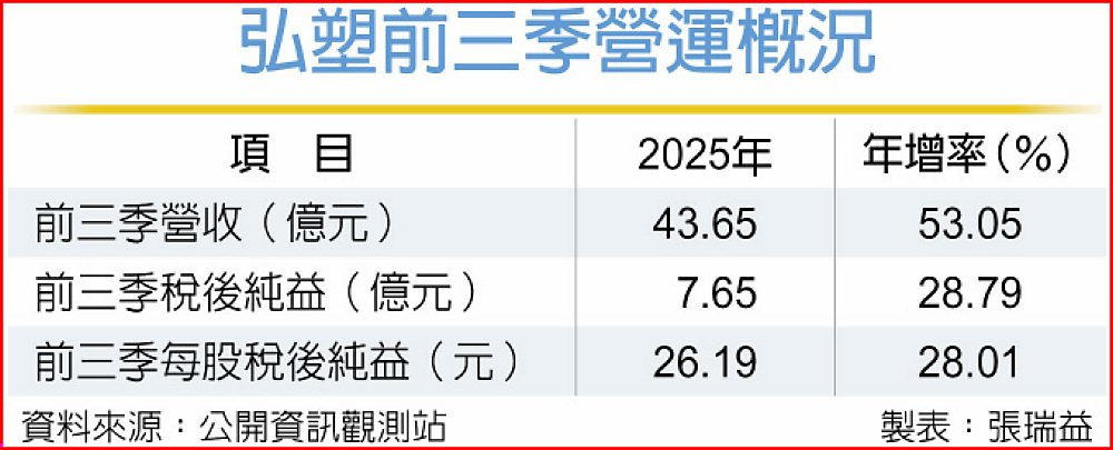 弘塑(3131)公布2025年前三季財報,在AI、HPC及先進封裝設備需求強勁帶動下,本業獲利全面攀升,前三季每股稅後純益(EPS)26.19元,改寫歷年同期新高,法人指出,弘塑在台積電與海外晶圓廠擴產周期中具有高度綁定度,特別是在先進製程關鍵設備模組及客製化工程領域需求暢旺,預期今年全年EPS挑戰逾30元,2026年仍將受惠設備需求持續暢旺。