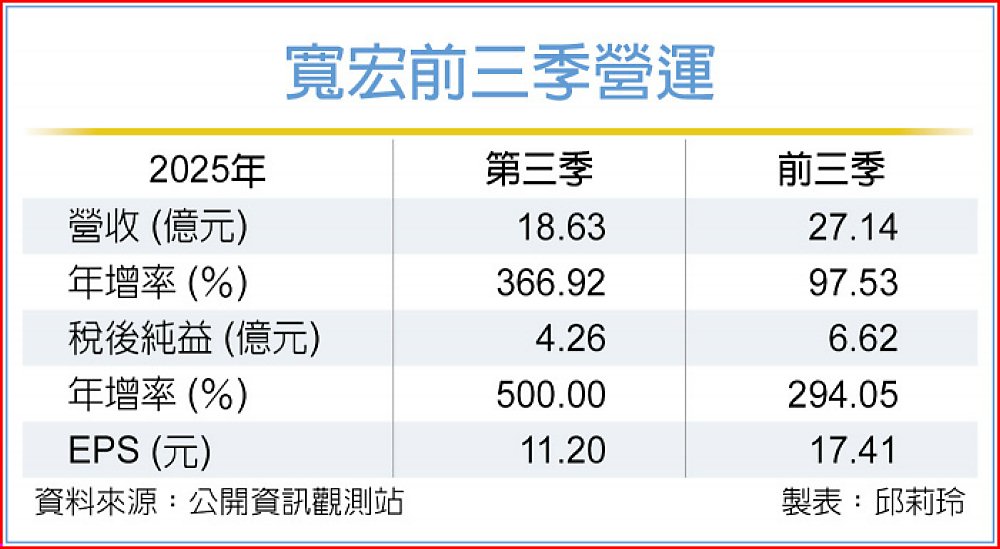 寬宏累計前三季營收27.14億元、年增97.53%,毛利率約38%,稅後純益6.62億元、年增294%,EPS為17.41元。