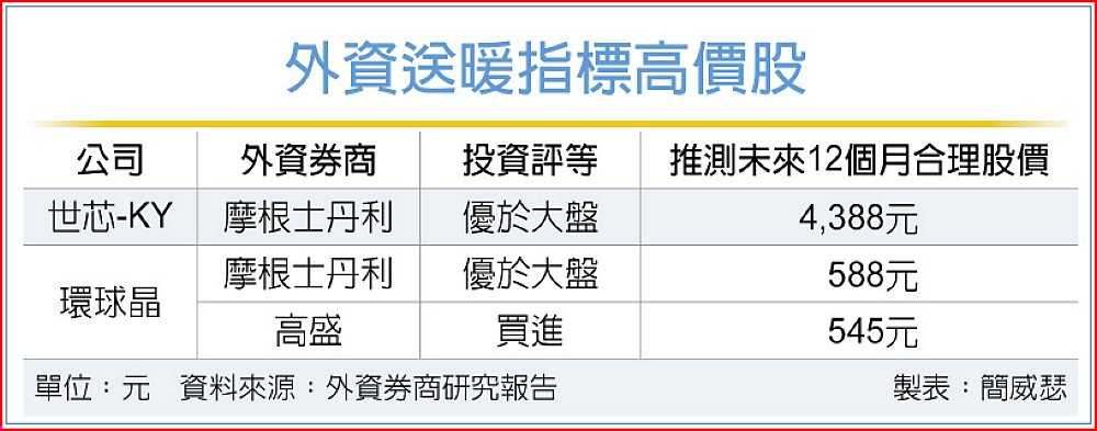 台股5日遭逢創高以來較大幅度回檔,各人氣電子指標股幾乎全面開低,外資不僅未棄守弱勢高價股,反而雪中送炭,摩根士丹利證券逆勢調升世芯-KY股價預期,高盛證券則力挺遭打落跌停的環球晶,推測合理股價各是4,388元與545元,二檔弱勢高價股若能加速止穩,將有利台股反彈。