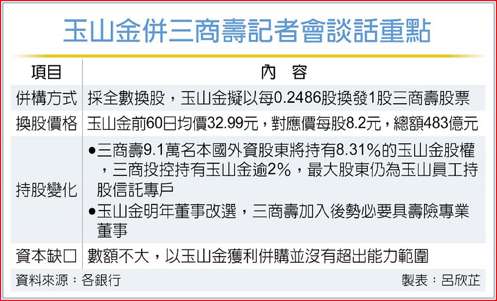 此案是以玉山金前60日均價32.99元計算,交易完成後,三商壽全體約9.1萬名本國與外資股東持有約8.31%的玉山金股權。市場關注換股後,原三商壽大股東翁家、陳家是否會參與實際經營層?黃男州說,換算三商投控持有玉山金逾2%,但目前玉山金最大股東是玉山員工持股信託專戶,持有比重4.37%,最大群體則是外資持股約31%。他還說,玉山金明年要改選董事,三商壽加入玉山後,董事會也會需要有壽險專業的董事加入,這是法律規定。