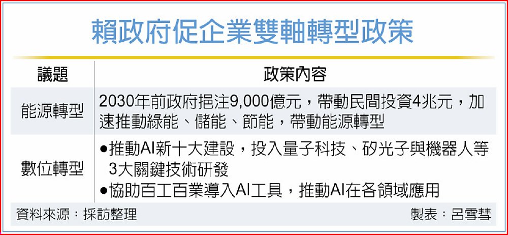 賴總統指出,當前各國都面臨淨零轉型、數位轉型、地緣政治劇烈變動,及全球經貿秩序重整的挑戰,政府將以創新經濟、均衡台灣、包容成長為目標,且落實2050淨零轉型的國家發展方向,因應挑戰;政府預計在2030年前挹注9,000億元,帶動民間投資4兆元,加速推動綠能、儲能、節能,引導國內外綠色投資,推動能源轉型,也促進產業升級轉型。