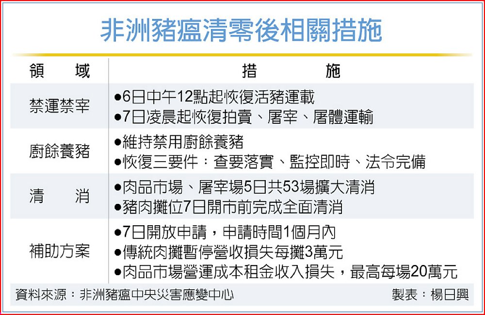 同時,在豬肉攤位7日開市前,要完成全面清消,此部分由經濟部督導地方政府進行。而農業部也將與衛福部協力,督導豬隻屠體運輸車全面進行清消作業。