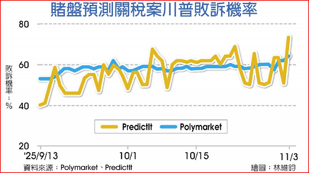 美國最高法院5日開庭審理川普總統對全球課徵關稅是否逾越職權,這是最高法院首次全面審視川普第二個任期關鍵政策的合法性,這項裁決攸關美國和全球其他經濟體。博弈市場並不看好川普能勝訴,賭盤押注川普敗訴的機率達60%。