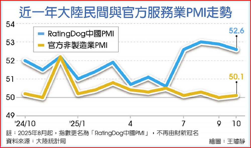 姚煜稱,總體而言,10月份服務業需求保持擴張。儘管複雜的貿易條件抑制了出口業務,但大陸需求的改善,繼續推動新訂單擴張。值得注意的是,就業的持續收縮和利潤率的壓力,仍然是服務業面臨的主要制約因素。