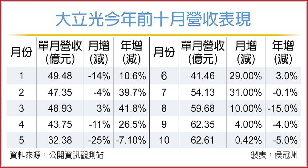 大立光10月營收62.61億元,與上月營收持平,但較去年同期衰退5%,寫今年營收新高;前十月累計營收501.9億元,年增5%。展望後市,大立光維持與先前法說會相同看法,預期11月出貨動能將較10月下滑。